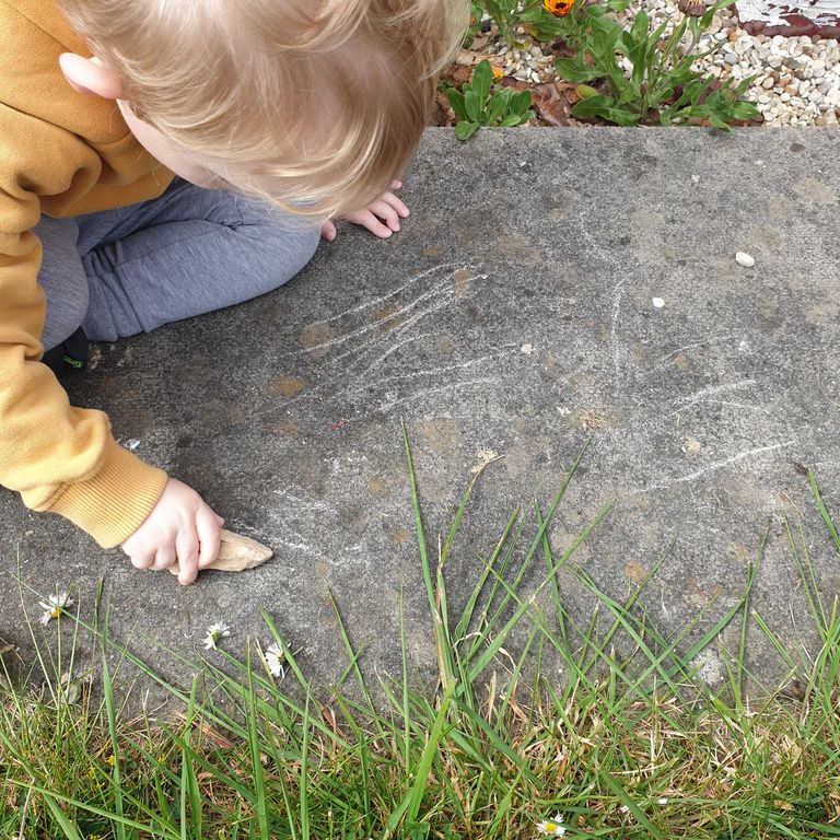 So we counted them together. I then asked him if he could tell me what was different about them. He began to describe the different colours. We then started talking about which ones were rough or smooth and he accidentally discovered that he could use some as chalk. So he started to test them all out to see which ones he could draw with.